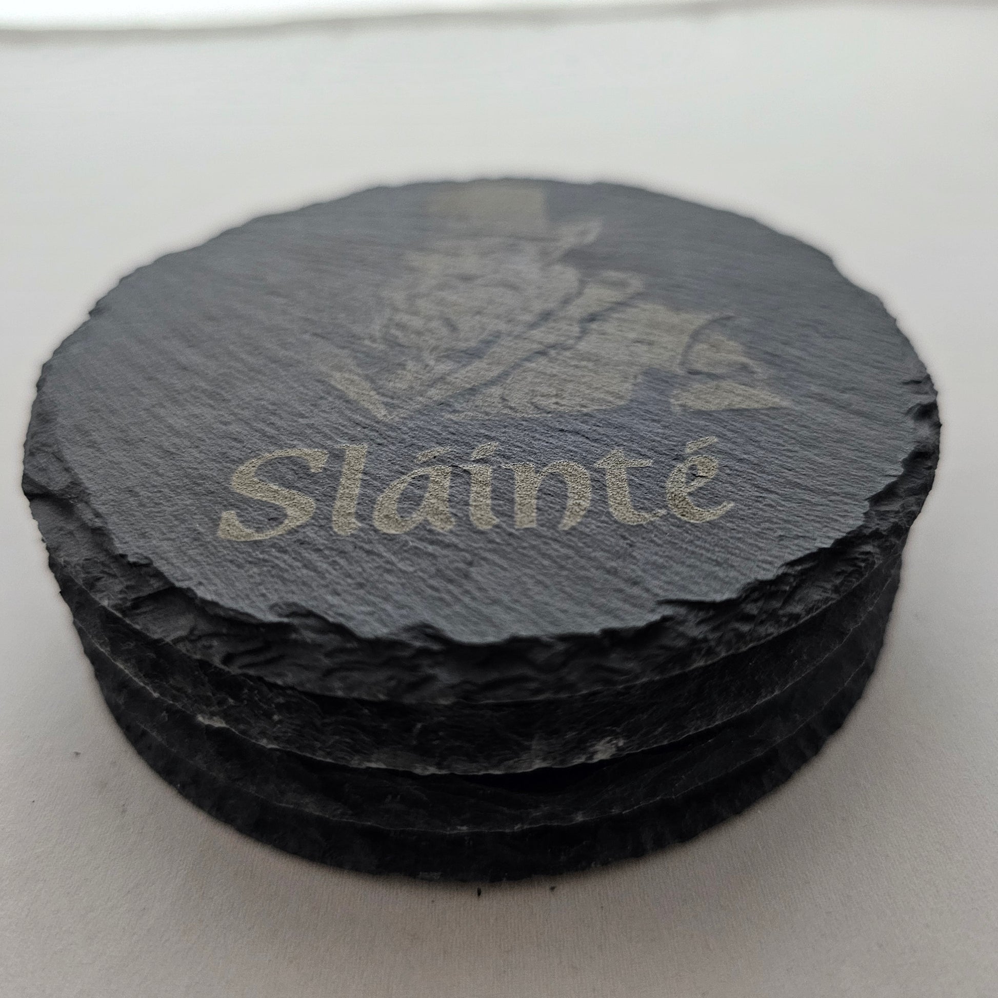 - **"Sláinte" Engraving:** The word "Sláinte" is elegantly engraved on each coaster, creating a cohesive and meaningful set.